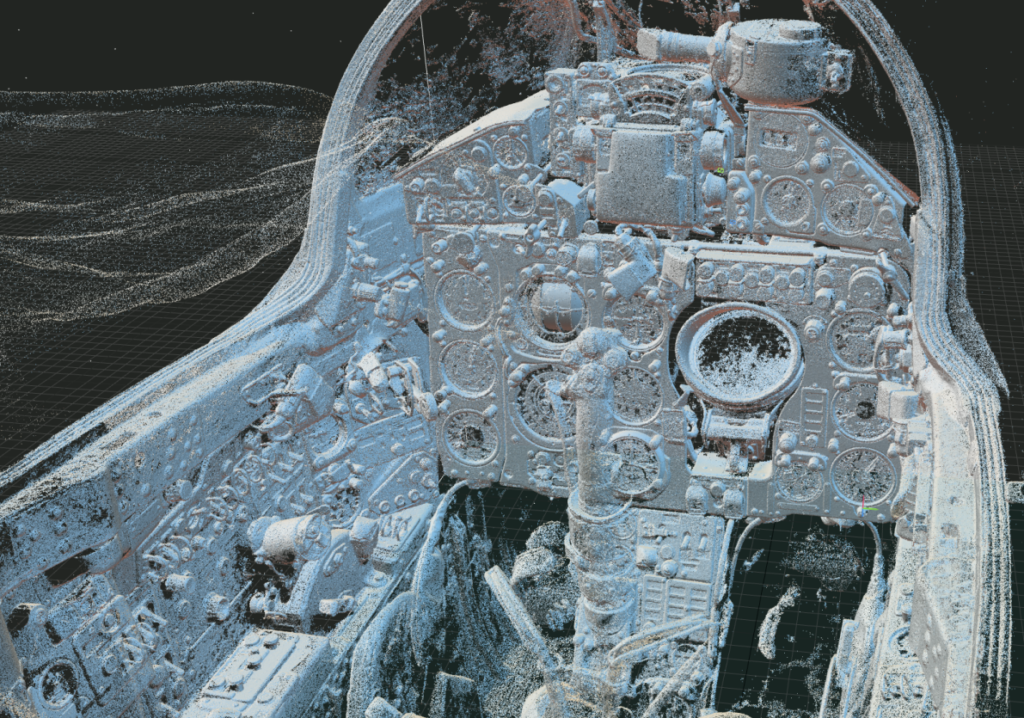 The attached pictures show closely the process at various stages: creation of the points cloud, mesh model reconstruction and finally texturing. This model will be a fine template to create the new cockpit for the MiG-21bis.